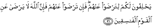 96. Mereka akan bersumpah kepadamu, agar kamu ridha kepada mereka. Tetapi jika sekiranya kamu ridha kepada mereka, sesungguhnya Allah tidak ridha kepada orang-orang yang fasik itu.