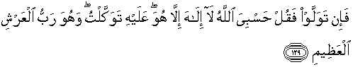 129. Jika mereka berpaling (dari keimanan), maka katakanlah: "Cukuplah Allah bagiku; tidak ada Tuhan selain Dia. Hanya kepada-Nya aku bertawakkal dan Dia adalah Tuhan yang memiliki 'Arsy yang agung."