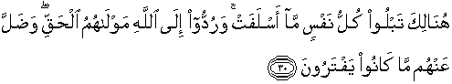 30. Di tempat itu (padang Mahsyar), tiap-tiap diri merasakan pembalasan dari apa yang telah dikerjakannya dahulu dan mereka dikembalikan kepada Allah Pelindung mereka yang sebenarnya dan lenyaplah dari mereka apa yang mereka ada-adakan.