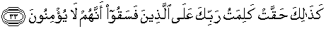 33. Demikianlah telah tetap hukuman Tuhanmu terhadap orang-orang yang fasik, karena sesungguhnya mereka tidak beriman.