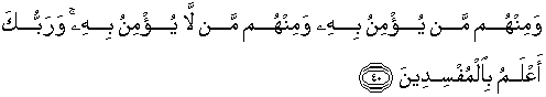 40. Di antara mereka ada orang-orang yang beriman kepada Al Quran, dan di antaranya ada (pula) orang-orang yang tidak beriman kepadanya. Tuhanmu lebih mengetahui tentang orang-orang yang berbuat kerusakan.