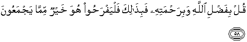 58. Katakanlah: "Dengan kurnia Allah dan rahmat-Nya, hendaklah dengan itu mereka bergembira. Kurnia Allah dan rahmat-Nya itu adalah lebih baik dari apa yang mereka kumpulkan."