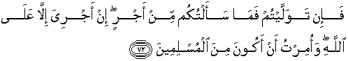 72. Jika kamu berpaling (dari peringatanku), aku tidak meminta upah sedikitpun dari padamu. Upahku tidak lain hanyalah dari Allah belaka, dan aku disuruh supaya aku termasuk golongan orang-orang yang berserah diri (kepada-Nya)."