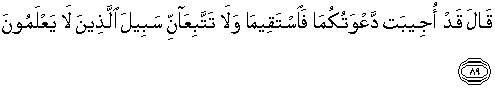 89. AlIah berfirman: "Sesungguhnya telah diperkenankan permohonan kamu berdua, sebab itu tetaplah kamu berdua pada jalan yang lurus dan janganlah sekali-kali kamu mengikuti jalan orang-orang yang tidak mengetahui."