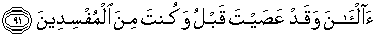 91. Apakah sekarang (baru kamu percaya), padahal sesungguhnya kamu telah durhaka sejak dahulu, dan kamu termasuk orang-orang yang berbuat kerusakan.