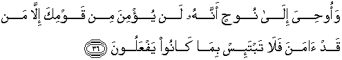 36. Dan diwahyukan kepada Nuh, bahwasanya sekali-kali tidak akan beriman di antara kaummu, kecuali orang yang telah beriman (saja), karena itu janganlah kamu bersedih hati tentang apa yang selalu mereka kerjakan.