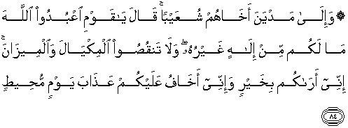 84. Dan kepada (penduduk) Mad-yan (Kami utus) saudara mereka, Syu'aib. Ia