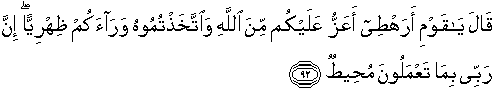 92. Syu'aib menjawab: "Hai kaumku, apakah keluargaku lebih terhormat menurut pandanganmu daripada Allah, sedang Allah kamu jadikan sesuatu yang terbuang di belakangmu?. Sesungguhnya (pengetahuan) Tuhanku meliputi apa yang kamu kerjakan."