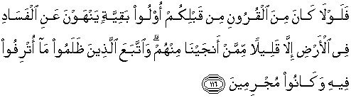 116. Maka mengapa tidak ada dari umat-umat yang sebelum kamu orang-orang yang