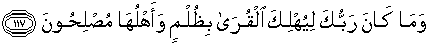 117. Dan Tuhanmu sekali-kali tidak akan membinasakan negeri-negeri secara zalim, sedang penduduknya orang-orang yang berbuat kebaikan.