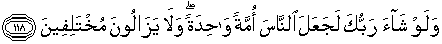 118. Jikalau Tuhanmu menghendaki, tentu Dia menjadikan manusia umat yang satu, tetapi mereka senantiasa berselisih pendapat,