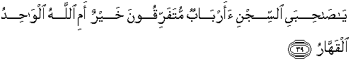 39. Hai kedua penghuni penjara, manakah yang baik, tuhan-tuhan yang bermacam-macam itu ataukah Allah Yang Maha Esa lagi Maha Perkasa?