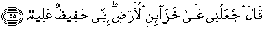 55. Berkata Yusuf: "Jadikanlah aku bendaharawan negara (Mesir); sesungguhnya aku adalah orang yang pandai menjaga, lagi berpengetahuan."