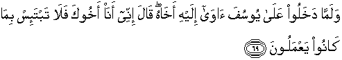 69. Dan tatkala mereka masuk ke (tempat) Yusuf. Yusuf membawa saudaranya (Bunyamin) ke tempatnya, Yusuf berkata : "Sesungguhnya aku (ini) adalah saudaramu, maka janganlah kamu berdukacita terhadap apa yang telah mereka kerjakan."