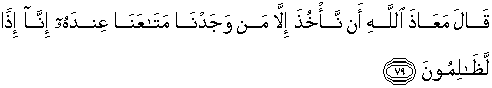 79. Berkata Yusuf: "Aku mohon perlindungan kepada Allah daripada menahan seorang, kecuali orang yang kami ketemukan harta benda kami padanya, jika kami berbuat demikian, maka benar-benarlah kami orang-orang yang zalim."