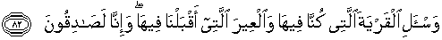 82. Dan tanyalah (penduduk) negeri yang kami berada disitu, dan kafilah yang kami datang bersamanya, dan sesungguhnya kami adalah orang-orang yang benar."
