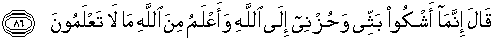 86. Ya'qub menjawab: "Sesungguhnya hanyalah kepada Allah aku mengadukan kesusahan dan kesedihanku, dan aku mengetahui dari Allah apa yang kamu tiada mengetahuinya."