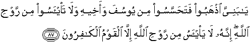 87. Hai anak-anakku, pergilah kamu, maka carilah berita tentang Yusuf dan saudaranya dan jangan kamu berputus asa dari rahmat Allah. Sesungguhnya tiada berputus asa dari rahmat Allah, melainkan kaum yang kafir."