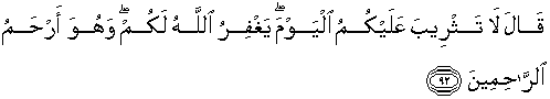 92. Dia (Yusuf) berkata: "Pada hari ini tak ada cercaan terhadap kamu, mudah-mudahan Allah mengampuni (kamu), dan Dia adalah Maha Penyayang diantara para penyayang."