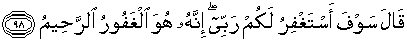98. Ya'qub berkata: "Aku akan memohonkan ampun bagimu kepada Tuhanku. Sesungguhnya Dia-lah Yang Maha Pengampun lagi Maha Penyayang."