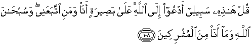 108. Katakanlah: "Inilah jalan (agama) ku, aku dan orang-orang yang mengikutiku mengajak (kamu) kepada Allah dengan hujjah yang nyata, Maha Suci Allah, dan aku tiada termasuk orang-orang yang musyrik."