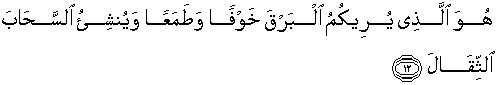 12. Dia-lah Tuhan yang memperlihatkan kilat kepadamu untuk menimbulkan ketakutan dan harapan, dan Dia mengadakan awan mendung.