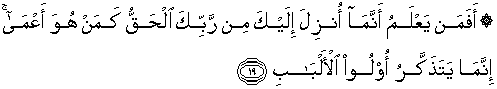 19. Adakah orang yang mengetahui bahwasanya apa yang diturunkan kepadamu dari Tuhanmu itu benar sama dengan orang yang buta? Hanyalah orang-orang yang berakal saja yang dapat mengambil pelajaran,
