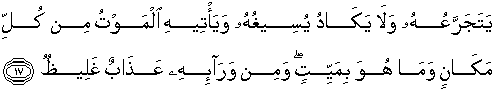 17. diminumnnya air nanah itu dan hampir dia tidak bisa menelannya dan datanglah (bahaya) maut kepadanya dari segenap penjuru, tetapi dia tidak juga mati, dan dihadapannya masih ada azab yang berat.