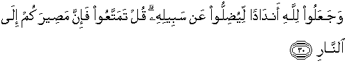 30. Orang-orang kafir itu telah menjadikan sekutu-sekutu bagi Allah supaya mereka menyesatkan (manusia) dari jalan-Nya. Katakanlah: "Bersenang-senanglah kamu, karena sesungguhnya tempat kembalimu ialah neraka."