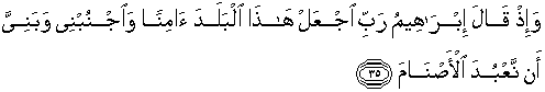 35. Dan (ingatlah), ketika Ibrahim berkata: "Ya Tuhanku, jadikanlah negeri ini (Mekah), negeri yang aman, dan jauhkanlah aku beserta anak cucuku daripada menyembah berhala-berhala.