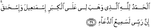 39. Segala puji bagi Allah yang telah menganugerahkan kepadaku di hari tua (ku) Ismail dan Ishaq. Sesungguhnya Tuhanku, benar-benar Maha Mendengar (memperkenankan) doa.