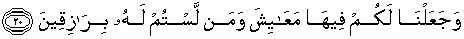 20. Dan Kami telah menjadikan untukmu di bumi keperluan-keperluan hidup, dan (Kami menciptakan pula) makhluk-makhluk yang kamu sekali-kali bukan pemberi rezki kepadanya.