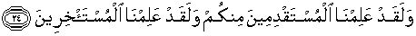 24. Dan sesungguhnya Kami telah mengetahui orang-orang yang terdahulu daripada-mu dan sesungguhnya Kami mengetahui pula orang-orang yang terkemudian (daripadamu).