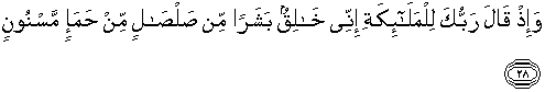 28. Dan (ingatlah), ketika Tuhanmu berfirman kepada para malaikat: "Sesungguhnya Aku akan menciptakan seorang manusia dari tanah liat kering (yang berasal) dari lumpur hitam yang diberi bentuk,