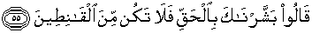 55. Mereka menjawab: "Kami menyampaikan kabar gembira kepadamu dengan benar, maka janganlah kamu termasuk orang-orang yang berputus asa."