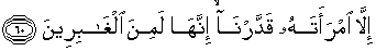 60. kecuali istrinya. Kami telah menentukan, bahwa sesungguhnya ia itu termasuk orang-orang yang tertinggal (bersama-sama dengan orang kafir lainnya)."