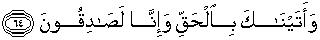 64. Dan kami datang kepadamu membawa kebenaran dan sesungguhnya kami betul-betul orang-orang benar.