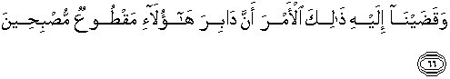 66. Dan telah Kami wahyukan kepadanya (Luth) perkara itu, yaitu bahwa mereka akan ditumpas habis di waktu subuh.
