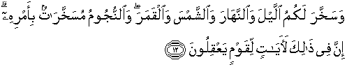 12. Dan Dia menundukkan malam dan siang, matahari dan bulan untukmu. Dan bintang-bintang itu ditundukkan (untukmu) dengan perintah-Nya. Sesungguhnya pada yang demikian itu benar-benar ada tanda-tanda (kekuasaan Allah) bagi kaum yang memahami (nya),