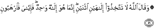 51. Allah berfirman: "Janganlah kamu menyembah dua tuhan; sesungguhnya Dialah Tuhan Yang Maha Esa, maka hendaklah kepada-Ku saja kamu takut."