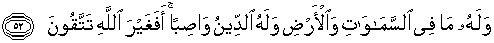 52. Dan kepunyaan-Nya-lah segala apa yang ada di langit dan di bumi, dan untuk-Nya-lah ketaatan itu selama-lamanya. Maka mengapa kamu bertakwa kepada selain Allah?