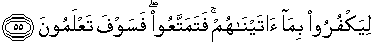 55. Biarlah mereka mengingkari nikmat yang telah Kami berikan kepada mereka; maka bersenang-senanglah kamu. Kelak kamu akan mengetahui (akibatnya).