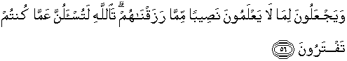 56. Dan mereka sediakan untuk berhala-berhala yang mereka tiada mengetahui (kekuasaannya), satu bahagian dari rezki yang telah Kami berikan kepada mereka. Demi Allah, sesungguhnya kamu akan ditanyai tentang apa yang telah kamu ada-adakan.