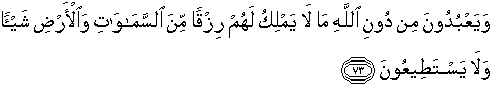 73. Dan mereka menyembah selain Allah, sesuatu yang tidak dapat memberikan rezki kepada mereka sedikitpun dari langit dan bumi, dan tidak berkuasa (sedikit juapun).