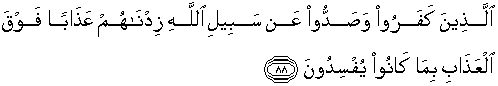 88. Orang-orang yang kafir dan menghalangi (manusia) dari jalan Allah, Kami tambahkan kepada mereka siksaan di atas siksaan
