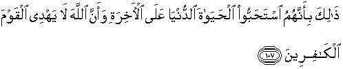 107. Yang demikian itu disebabkan karena sesungguhnya mereka mencintai kehidupan di dunia lebih dari akhirat, dan bahwasanya Allah tiada memberi petunjuk kepada kaum yang kafir.
