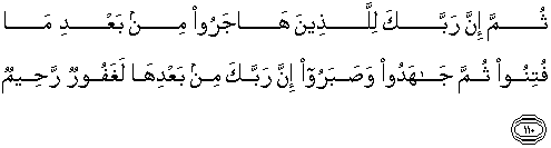 110. Dan sesungguhnya Tuhanmu (pelindung) bagi orang-orang yang berhijrah sesudah menderita cobaan, kemudian mereka berjihad dan sabar; sesungguhnya Tuhanmu sesudah itu benar-benar Maha Pengampun lagi Maha Penyayang.