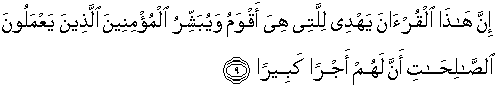 9. Sesungguhnya Al Quran ini memberikan petunjuk kepada (jalan) yang lebih lurus dan memberi khabar gembira kepada orang-orang Mu'min yang mengerjakan amal saleh bahwa bagi mereka ada pahala yang besar,