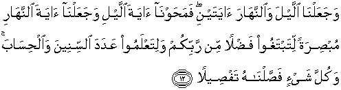 12. Dan Kami jadikan malam dan siang sebagai dua tanda, lalu Kami hapuskan