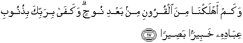 17. Dan berapa banyaknya kaum sesudah Nuh telah Kami binasakan. Dan cukuplah Tuhanmu Maha Mengetahui lagi Maha Melihat dosa hamba-hamba-Nya.
